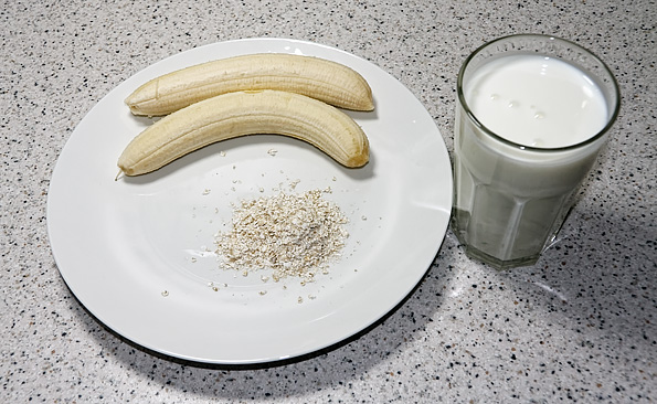 Ингредиенты: бананы — 2 шт., овсяные хлопья — 7 ст. л., йогурт натуральный (или кефир, ряженка, ацидофилин и т. п.) — 500 граммов, сахар — по вкусу.