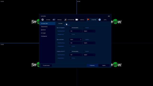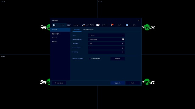 Раздел «Система» позволяет настроить язык, имя устройства, формат видеовыхода, время и дату. Заметим, что кроме получения информации о точном времени с внешнего сервера, виртуальная матрица может выступать и сервером NTP для других видеорегистраторов и камер, что может быть удобно с точки зрения управляемости. Дополнительно можно запрограммировать собственный список выходных дней для более корректной работы сценариев по расписанию.