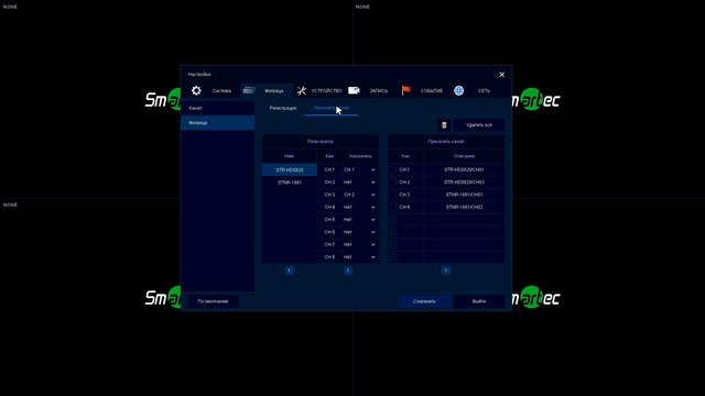 Следующая группа — «Матрица» посвящена настройке взаимодействия виртуальной матрицы с сетевыми видеорегистраторами. Сначала нужно настроить подключение к ним, а потом распределить камеры с них по каналам виртуальной матрицы.