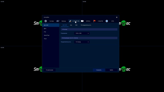 На изображениях с камер есть отметки названия канала и текущего режима записи. Могут также показываться значки PTZ, передачи звука и тревоги. Двойной щелчок мышкой открывает изображение с выбранной камеры на полный экран. При наличии PTZ в камерах управлять этой функцией можно с трекбола, после соответствующей настройки оборудования.
