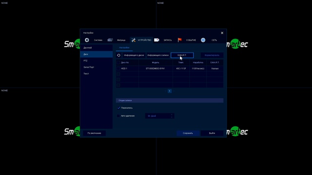 В этой же группе проводится форматирование и обслуживание жестких дисков. Для них предусмотрен контроль параметров SMART и температуры. Правда подробную информацию получить не получится. Расписания для запуска периодических проверок также не предусмотрено. Отметим, что все жесткие диски используются системой в индивидуальном режиме. Несмотря на наличие возможности установки четырех винчестеров, сделать из них отказоустойчивый RAID-массив в данной модели нельзя. Дополнительно можно отключить режим автоматической перезаписи и ограничить максимальную длительность хранения видео записей.