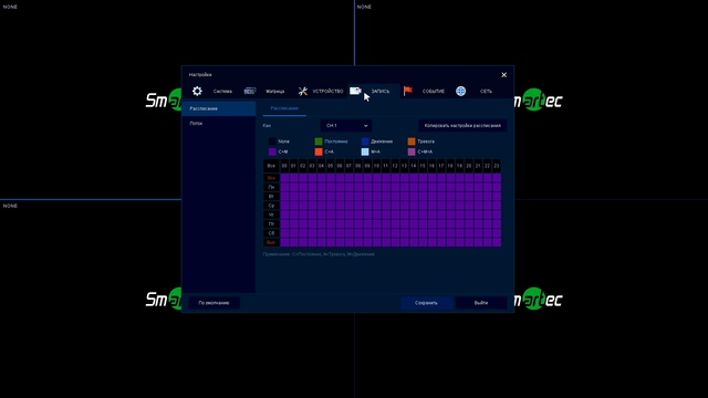 Для каждого канала (виртуального) можно настроить расписание с точностью до часа с выбором одного из вариантов, включая постоянную запись, запись при тревоге или движении, а также их комбинации.