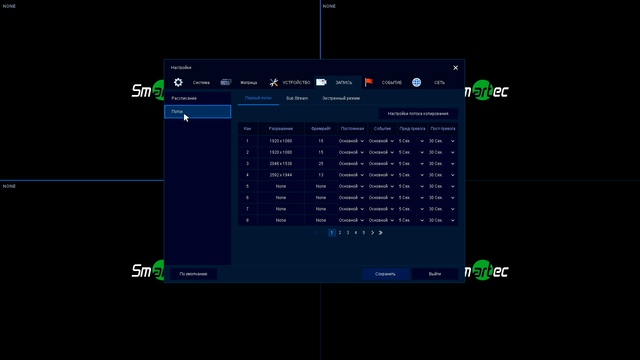 Поскольку сама виртуальная матрица может не только осуществлять прямую трансляцию видеоканалов, но их запись на встроенные винчестеры, то в меню присутствует пункт «Запись» для настройки этого режима.