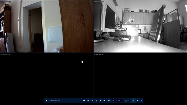 В режиме воспроизведения поддерживается синхронный просмотр записей сразу с нескольких каналов и аналогичный живой картинке выбор сетки. Стандартный набор органов управления позволяет использовать ускоренное (до 64×) и замедленное (до 1/8×) воспроизведение и перемотку.