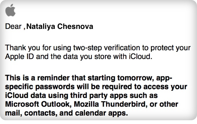 Сегодня Apple начала рассылку писем пользователям iCloud, активировавшим двухуровневую аутентификацию. Компания напоминает, что с 10 октября при попытке доступа к данным iCloud сторонних программ необходимо будет ввести специфический пароль.