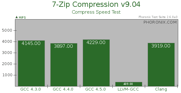 - При измерении скорости сжатия утилитой 7-zip, clang показал результаты на уровне GCC, а LLVM-GCC продемонстрировал десятикратный провал производительности. При кодировании MP3 паком LAME, Clang оказался медленнее GCC на 12%, а LLVM-GCC медленнее на 7%.