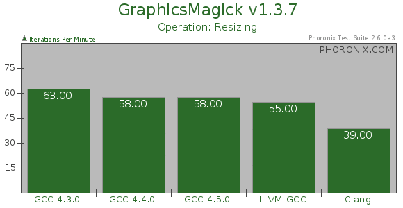 - В тесте GraphicsMagick Clang отстал от GCC на 18%, а LLVM-GCC наоборот обогнал GCC на 8%;