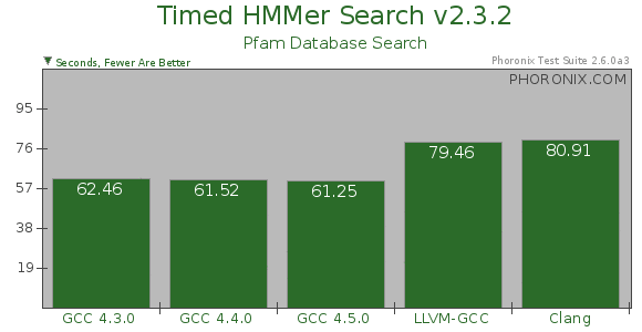 - В тесте HMMer LLVM-GCC и Clang оказались на 23% медленнее GCC.