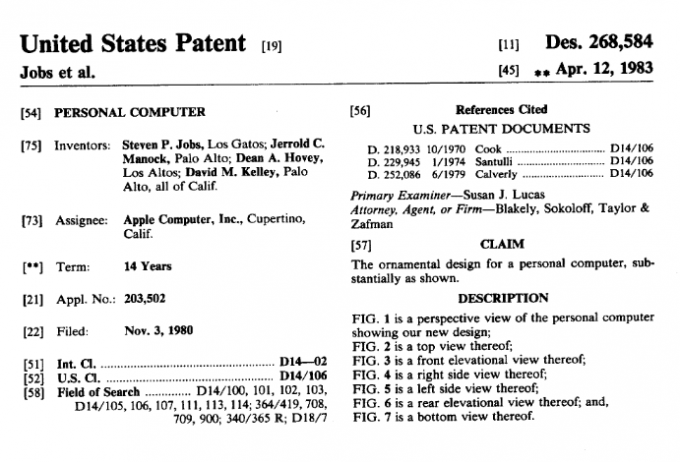 Первая, зарегистрированная на имя Стива Джобса, заявка на патент была подана в Патентное бюро США в 1980 году, а утверждена была только в 1983. Называлась она просто «Personal Computer» и описывала знакомый всем обычный персональный компьютер начала восьмидесятых.