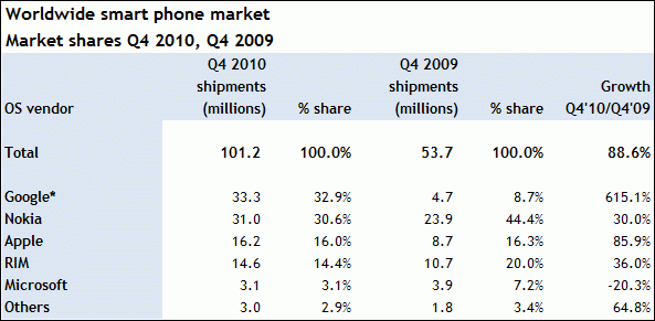 Кроме того, аналитическая компания Canalys опубликовала отчет о разделении рынка смартфонов в четвертом квартале 2010 года. Исследование показало, что в четвертом квартале прошлого года было продано 33.3 миллиона Android-смартфонов (в 4 квартале 2009 года - 4.7 млн), что позволило сдвинуть с пьедестала минувшего лидера - компанию Nokia, которой удалось продать 31 млн телефонов на базе платформы Symbian (в 4 квартале 2009 года - 23.9 млн).
