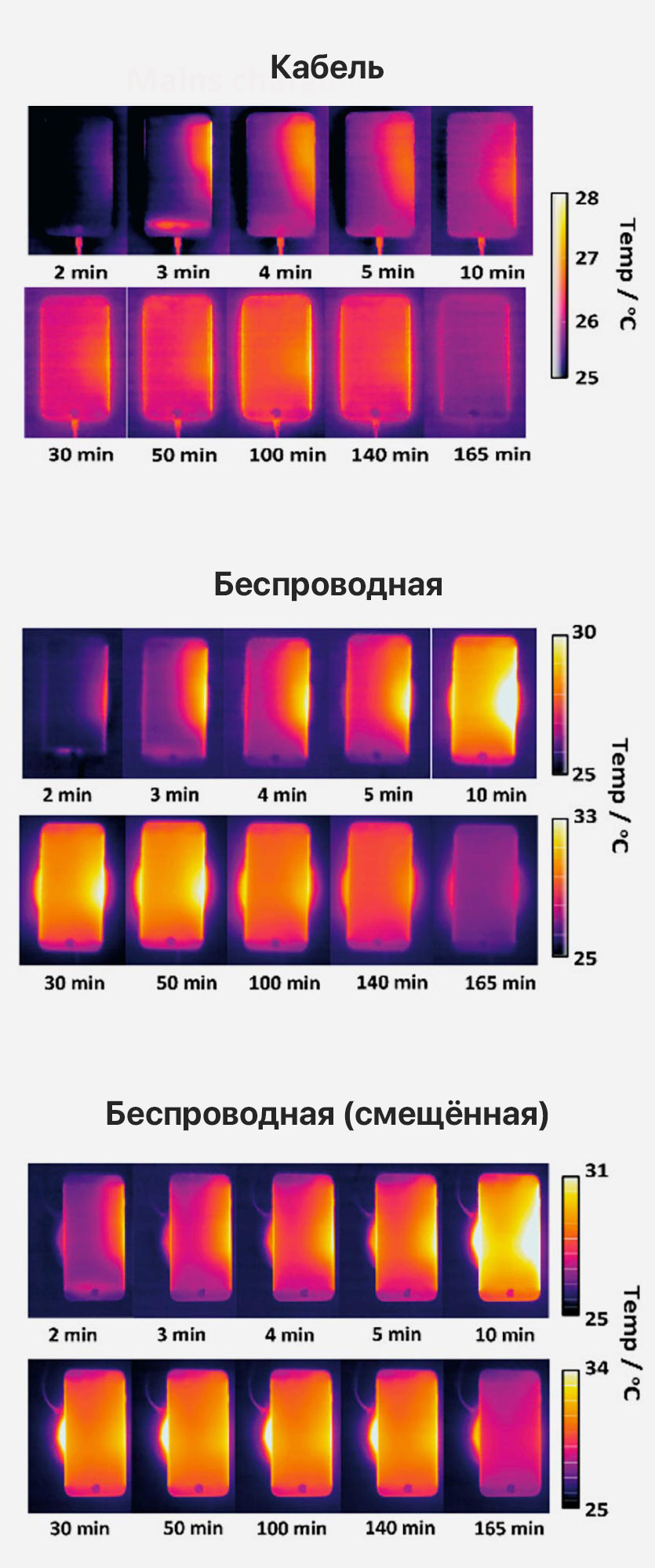 Если в этот момент к спинке смартфона прислонить работающую индуктивную катушку, температура закономерно растёт ещё сильнее.