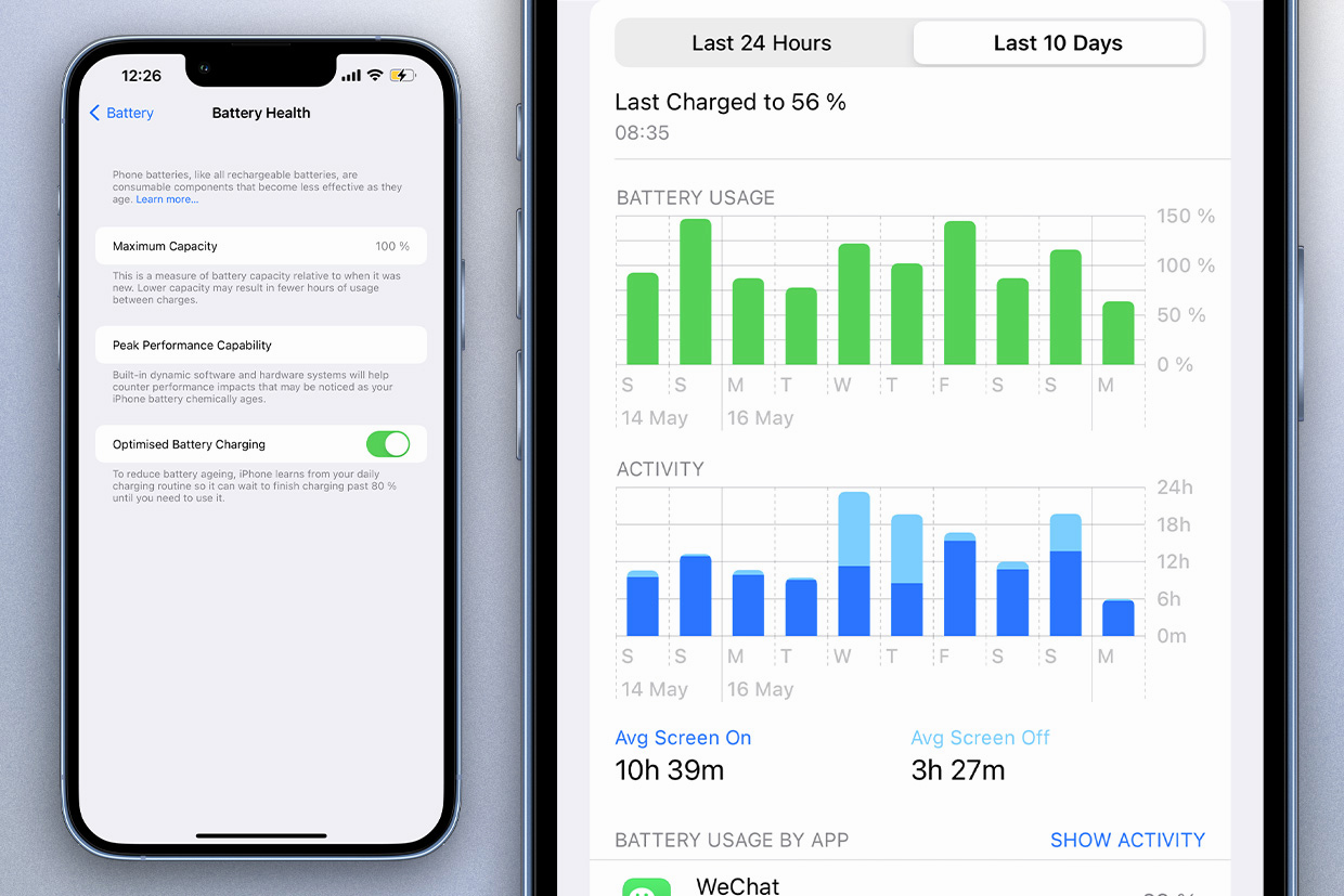 Пример 3. Купила iPhone 13 Pro Max в январе 2022 года. За 5 месяцев ресурс демонстрирует 100%. Средний расход 0,94 цикла или 94% в день при 10 часах 40 минутах экранного времени и 3 с половиной часах (VPN) в фоне.