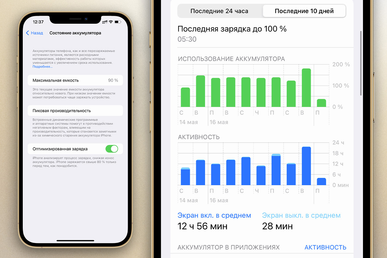 Пример 2. Купила iPhone 12 Pro Max в июне 2021 года. За 11 месяцев ресурс опустился до 90%. Средний расход 1,4 цикла или 140% в день при 13 часах экранного времени.