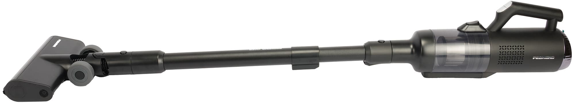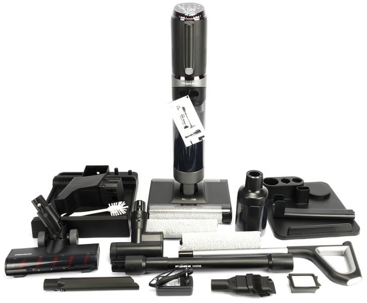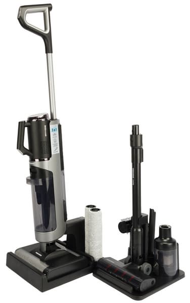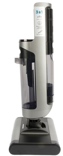 Моющий пылесос с богатой комплектацией также может работать в конфигурациях для сухой уборки и портативного пылесоса для уборки мебели, труднодоступных мест и салона автомобиля. Любая конфигурация включает в себя моторный блок с несъемным аккумулятором и дисплеем, отображающим мощность, режим, уровень заряда, заполнение бака водой, блокировку электрощетки, ошибки и другие параметры работы. Но наше тестирование показало, что основной и наиболее эффективный режим модели — именно влажная уборка с полноценным мытьем полов.