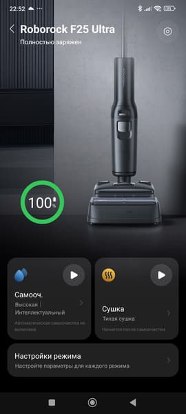 Управление интуитивно понятно: на D‑образной ручке три кнопки — выбор режима (автоматический, пар, горячая вода, удаление влаги), включение/выключение (длительное нажатие) и старт/остановка самоочистки (на базе). На дисплее отображаются уровень заряда, уровень загрязнения, подключение к Wi-Fi, выбранный режим, степень заряда аккумулятора и ошибки. Мобильное приложение расширяет возможности: можно настраивать мощность всасывания (бережная, сбалансированная, сушка пола), выбрать интенсивность подачи воды, скорость вращения моющего ролика, включить подсветку, отрегулировать громкость оповещений. Также доступны: дистанционное управление в горизонтальном положении, установка расхода моющего средства, мониторинг износа расходников, обновление прошивки, настройка самоочистки (сбалансированная, интеллектуальная, глубокая) и сушки (быстрая или тихая).