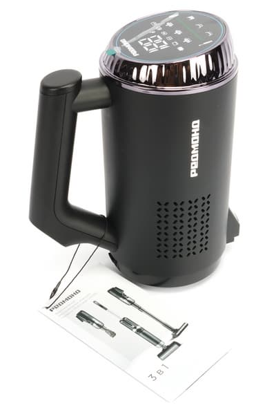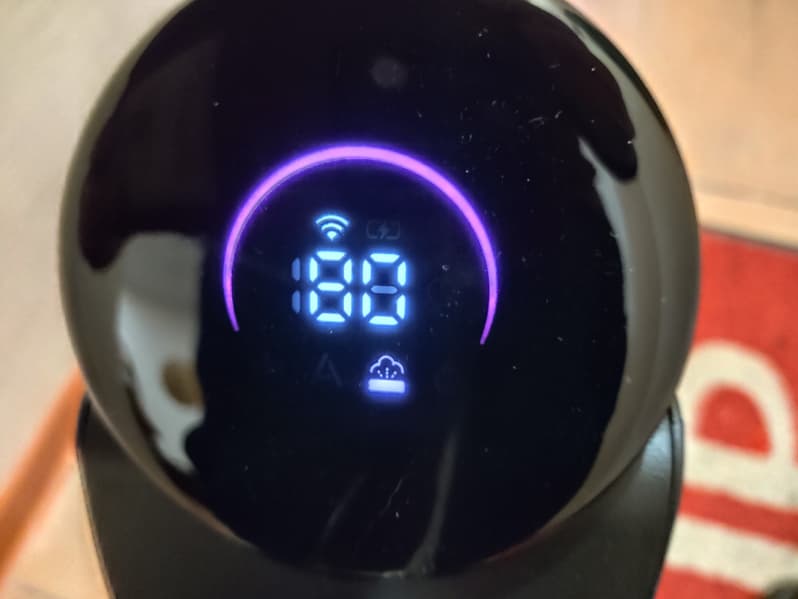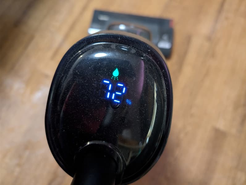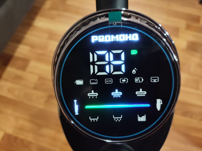 Светодиодный дисплей показывает заряд аккумулятора в процентах, время полной зарядки — 3 часа 15 минут. Управление — это три кнопки на ручке: включение/выключение, выбор режима мощности, (автоматический/повышенный), запуск самоочистки.