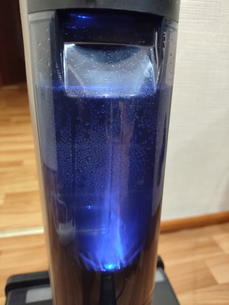 К преимуществам модели мы отнесли удобную систему самоочистки валиков, хотя повышенный уровень шума в начале режима очистки может мешать некоторым чувствительным людям. В процессе очистки участвуют ультрафиолетовый и электролизный обеззараживатели. За процессом электролиза интересно наблюдать: подсвеченная светодиодом вода «вскипает» вокруг электродов, образуя облака мельчайших пузырьков. После 20-секундного перформанса начинается самоочистка. Пылесос включает всасывание на максимум и подает воду на валики, три минуты промывая их и воздушный тракт. Естественно, опустошать бак для грязной воды и промывать его после этого нужно еще раз.