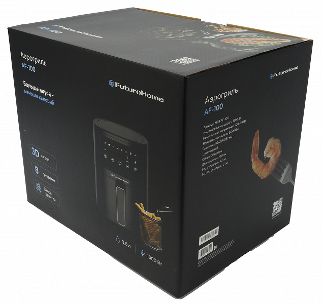 Аэрогриль прибыл на тесты в красивой коробке, оформленной в фирменном стиле бренда. На черном фоне мы видим фотографии аэрогриля, блюд, приготовленных с его помощью, а также указания технических характеристик модели и описание ее возможностей.
