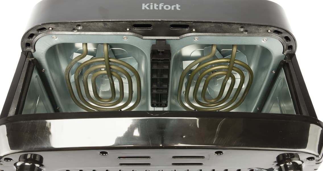 На фото выше вы видите тэны Kitfort КТ-2250 — только верхние, однако во время тестирования прибор показал себя хорошо и всё равномерно прожаривалось, оставаясь сочным внутри. Это говорит о хорошо рассчитанной мощности и о достаточной скорости работы вентилятора, обеспечивающего принудительную конвекцию. Тем не менее, в других моделях может быть иначе, и наличие нижних тэнов предпочтительнее.