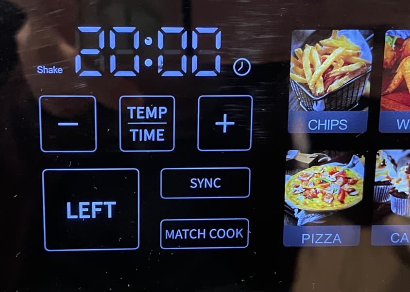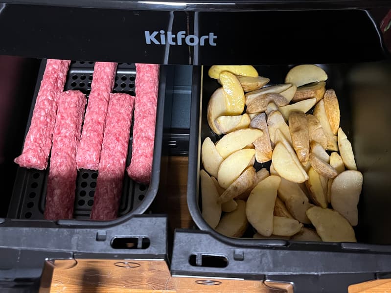Функция синхронизации для одновременного окончания приготовления блюд в разных корзинах — простая и действительно полезная, но предусмотренная не во всех аэрогрилях с двумя чашами. Если у одного блюда время приготовления дольше, чем у другого, то нажатие на кнопку синхронизации после того, как будут выставлены параметры температуры и времени для каждого нагревателя, запустит работу того нагревательного элемента, чье время работы должно быть дольше. А когда значения оставшегося времени у обоих тэнов сравняются, включится и второй тэн, чтобы приготовление завершилось одновременно. Именно так это реализовано в протестированных нами аэрогрилях Felfri FF-AF-04, Gressel GAF-1825 и Kitfort КТ-2250, и мы нашли это очень удобным, потому что не надо ждать, когда приготовится, например, мясо, если гарнир уже готов.