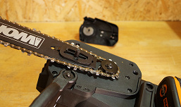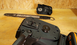 Шина укладывается в свое ложе так, чтобы цепь огибала рабочую шестерню. Конструкция фиксируется крышкой и завинчивается единственным болтом. Никакого ключа не требуется, его роль играет оранжевая откидывающаяся рукоятка.