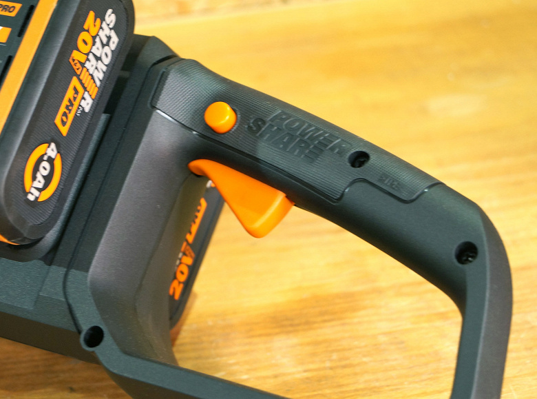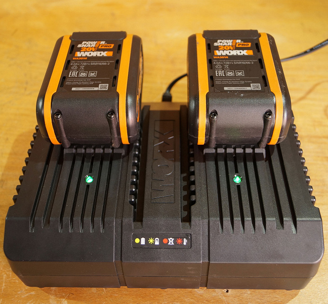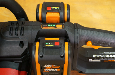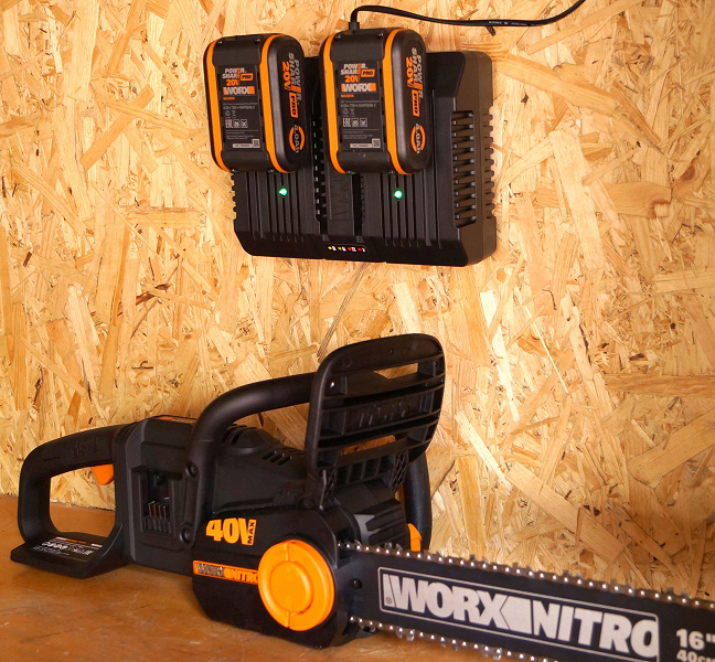 40-вольтовый мотор приводится в движение двумя 20-вольтовыми аккумуляторами Works, которые соединены последовательно и в сумме дают необходимый ток в 40 вольт. Эти батареи линейки Power Share подходят к большинству современных аккумуляторных инструментов Works.