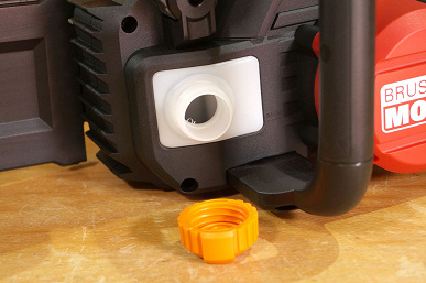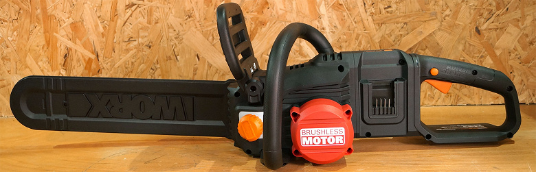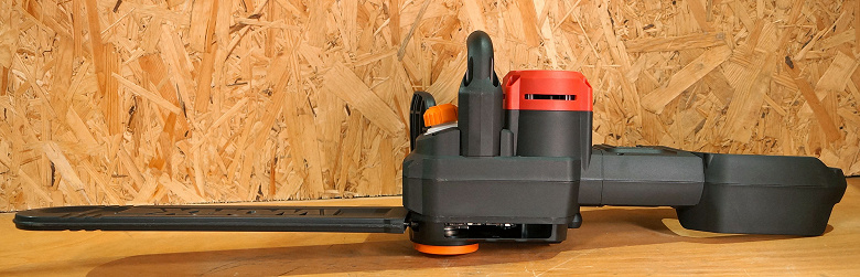 Сурово-черный корпус с оранжевыми деталями имеет привычную для всех цепных пил конструкцию. Бесщеточный электродвигатель для лучшего охлаждения выведен вбок и накрыт крышкой томатного цвета.