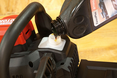 Любая цепная пила имеет систему смазки цепи. Масло снижает трение между цепью и шиной. Работать сухой цепью строго воспрещается: цепь быстро перегреется, посинеет, растянется, слетит с шины или вообще порвется, а на таких скоростях это недопустимо. Автоматическая смазка цепи имеется во всех современных цепных пилах. Масло, подаваемое в маслопровод, хранится в бачке небольшой емкости. В нашей пиле горловина масляного бачка расположена слева внизу.