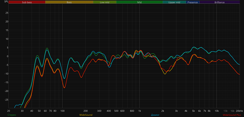 Посмотрим, как работают пресеты. А работают они не совсем так, как мы ожидали, исходя из их названия. Оба профиля WideSound заметно подчеркивают середину, что характерно для настроек, призванных сделать более читаемыми диалоги в фильмах. Профиль же «Диалог» при этом вообще не оказывает по-настоящему заметного влияния на тональный баланс.