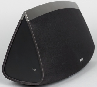 Heos 5 рассчитана уже только на горизонтальную установку. Ее корпус имеет габариты примерно 30×21×17 сантиметров. Форма в проекции близка к треугольнику. Нижняя часть и торцы выполнены из пластика, сверху все закрыто сеткой из ткани.