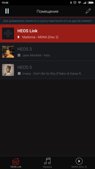 Основное окно утилиты имеет три страницы. На первой, которая озаглавлена «Помещения», представлены все найденные в локальной сети колонки и их состояние. В верхней строке есть кнопка быстрой остановки (постановки на паузу) всех устройств сразу и значок для вызова меню изменения названий колонок. Перед переходом на вторую или третью страницы нужно на первой выбрать управляемое устройство или группу. Последние организуются очень просто — перетаскиванием значка одного устройства на другое.