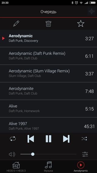 Третья страница аналогична привычным медиаплеером — в центре лого трансляции или обложка альбома, а под ней находятся кнопки управления воспроизведением и громкостью. Дополнительно можно выбрать индивидуальные уровни для устройств группы, изменить порядок проигрывания (если речь об альбомах или плейлистах). Значок в правом верхнем углу позволяет добавить поток в избранное, знак в левом верхнем углу — управлять списком воспроизведения.