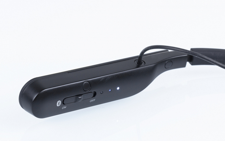 На правой стороне дужки расположен выключатель питания и три индикатора, отображающие режимы работы и уровень заряда. Здесь же находится встроенный микрофон, позволяющий использовать наушники в качестве гарнитуры.