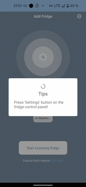 Чтобы завершить сопряжение, следует нажать на кнопку «Settings» на панели управления холодильником.