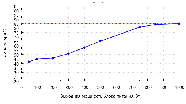 При работе на мощности 850 Вт шум блока питания находится на пониженном уровне для жилого помещения в дневное время суток — около 30 дБА с расстояния 0,35 метра.