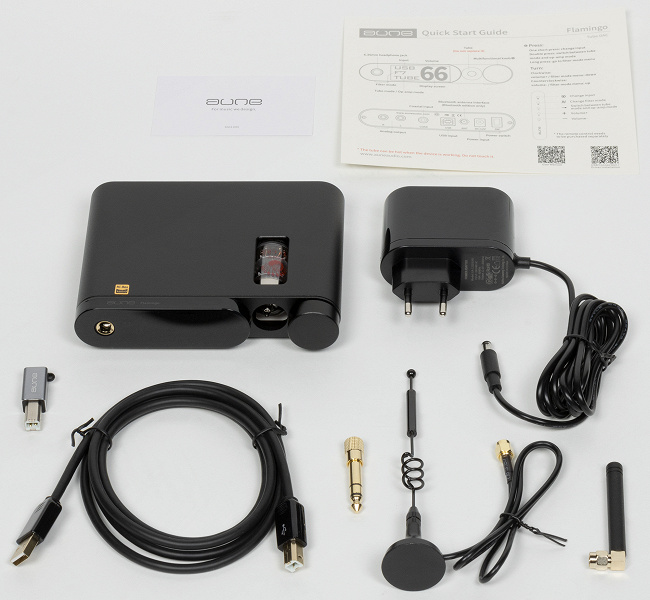 Комплект поставки обширный, в него входят: сам «цапоусилитель», документация, блок питания, переходники с USB-C на USB-B и с миниджека 3,5 мм на джек 6,3 мм, кабель USB-A — USB-B для подключения к источнику, две антенны для Bluetooth-передатчика, небольшие силиконовые накладки ножки.
