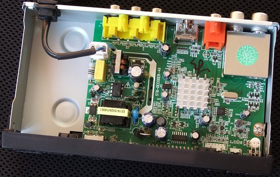 Печатная плата занимает примерно две трети корпуса, основная однокристальная система (system-on-a-chip, SoC) MSD7T01, разработанная MStar Semiconductor, закрыта радиатором. Прием сигнала осуществляется ВЧ-блоком Rafael Micro MR820T2 компании Rafael Microelectronics, закрытым экранирующим кожухом.
