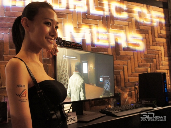Что интересно, другим своим анонсом ASUS даже подчеркивает, что 4K — пока что не для игр, а для красоты 2D-картинки. Речь о показанном здесь же геймерском мониторе ASUS PG278Q Swift с диагональю 27 дюймов и разрешением 2560×1440 точек — тоже большим, но очень далеким от QHD. Он интересен тем, что поддерживает частоту вертикальной развертки до 144 Гц, причем переключаться между разными режимами — 60, 120 или 144 Гц — можно при помощи аппаратной кнопки на тыльной стороне корпуса монитора. Время отклика матрицы составляет 1 мс — каким еще ему быть у геймерского дисплея?