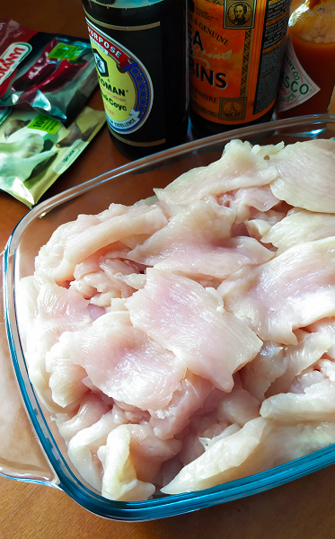 Полтора килограмма куриной грудки нарезали тонкими пластинами и замариновали в смеси соевого соуса, вустера, срирачи с копченой паприкой и сушеным чесноком.