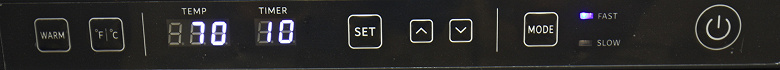 Панель управления состоит из двух дисплеев (один отображает температуру, второй — время, оставшееся до конца работы), двух индикаторов (режим Fast и режим Slow) и мембранных кнопок: