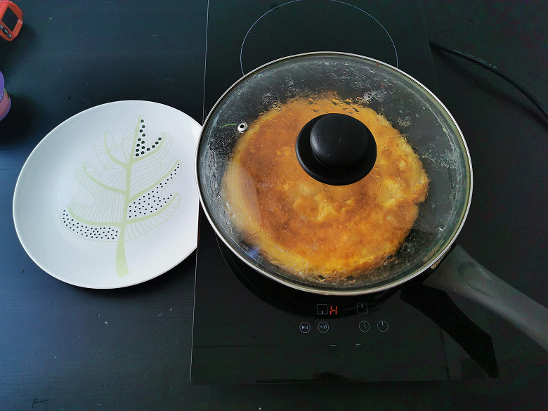 Примерно на четвертом блине плитка уже сильно нагрелась (мы использовали 9-й режим) и блинчики стали немного подгорать, а когда мы путем проб добрались до идеального режима 6, наши блинчики стали пропекаться дольше из-за больших интервалов между нагревами. Это не было критично, но значительно замедлило процесс выпекания.