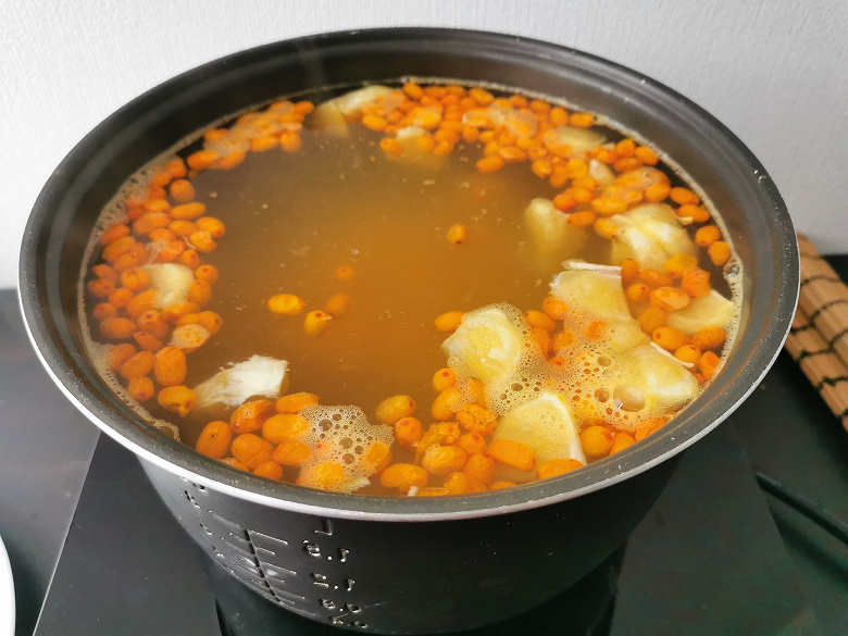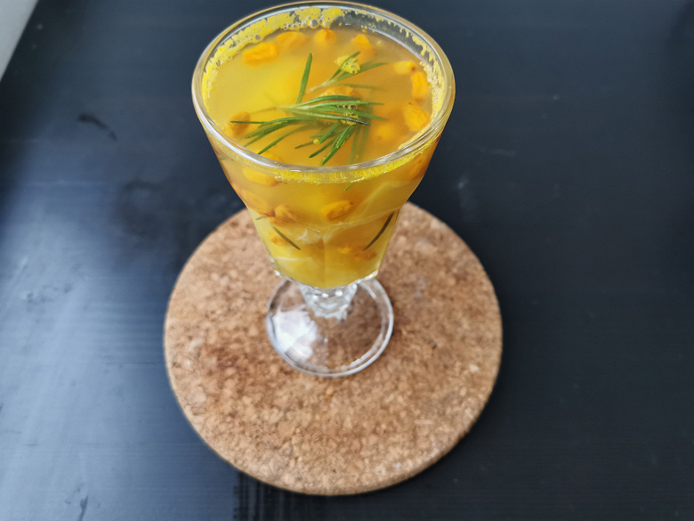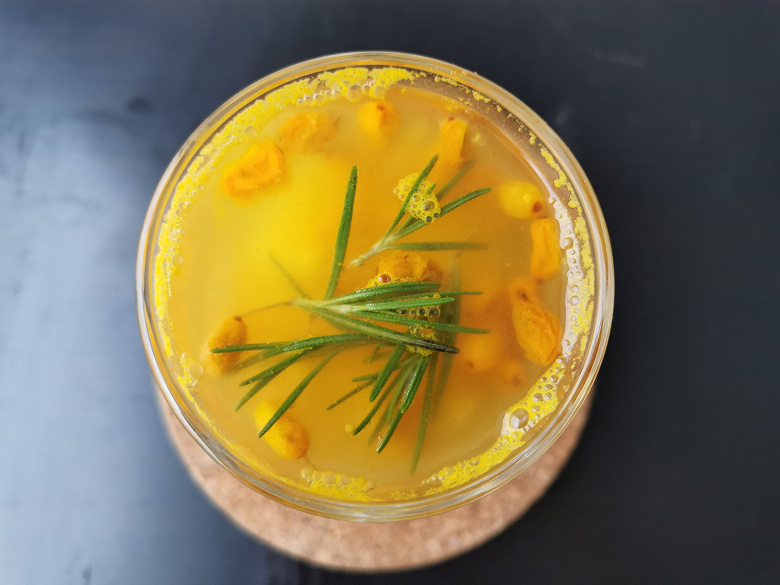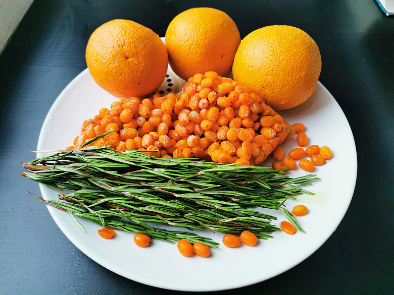 В составе компота были использованы свежие апельсины и розмарин, замороженная облепиха и натуральный сахарозаменитель.