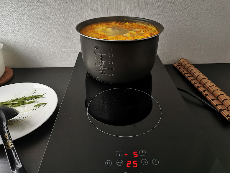 Прибор хорошо проявил себя практически на всех этапах готовки. Медленная варка супа и компота, поджаривание омлета — все прошло на ура. Единственное неудобство у нас возникло во время выпечки блинов — приостановка нагрева во время использования режимов 1—8 мешает блину пропекаться достаточно быстро, а при переключении на 9-й (максимальный) режим мощности у блина появляется высокий риск сгореть. Тем не менее, наши блинчики получились замечательными, хоть на них и ушло чуть больше времени.