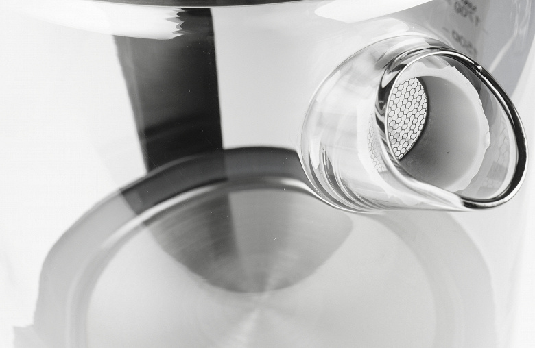 В стеклянный носик корпуса вставляется фильтр от накипи. Он полностью вынимается и представляет собой крупную сетку в силиконовом корпусе. Фильтр держится в носике за счет трения. Носик аккуратно влит в колбу корпуса, шов не заметен, а вот край носика не очень симметричный. Возможно, это особенность именно нашего экземпляра.