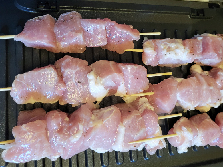 В книге рецептов есть вариант приготовления шашлыка из свинины. Там опять же, как и в случае с сыром и беконом, указан ручной режим: температура 180 °C и 4 минуты. Мы выставили температуру и время, включили гриль, но пока мы выкладывали шашлык на панели, 2 минуты из четырех заявленных уже прошли.
