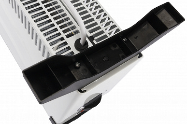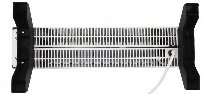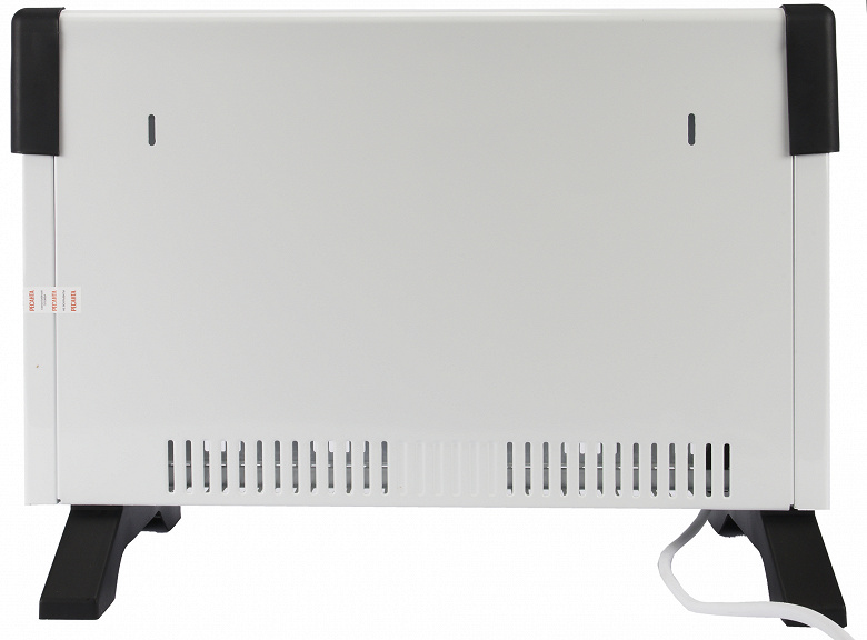 Так как прибор может быть установлен на стену, вентиляционная решетка сделана со скосом в одну сторону. А на обратной стороне обогревателя находятся отверстия для крепежа и небольшие вентиляционные отверстия снизу, чтобы задняя стенка не перегревалась.