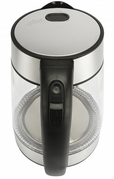 Управляется чайник с помощью кнопки включения/отключения, расположенной вверху на ручке сразу под кнопкой открывания крышки. При нажатии на кнопку начинается нагрев воды и включается голубоватая светодиодная подсветка.