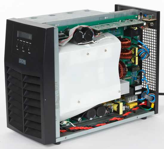 Внутри корпус состоит из двух частей, разделенных металлической перегородкой. С одной стороны находится батарейный блок, а с другой — вся необходимая электроника. Нельзя обойти вниманием тот факт, что для удешевления производства модели ИБП этой серии не оборудованы специальным отсеком для батарей и возможностью горячей замены.