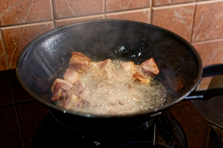 О, да! То, что надо: корочка мгновенно схватывается, мощности хватает, чтобы мясо не давало сок. Нагрев идет снизу, так что уже обжаренные партии двигаем повыше по бортикам, а на дно кидаем новую баранину.