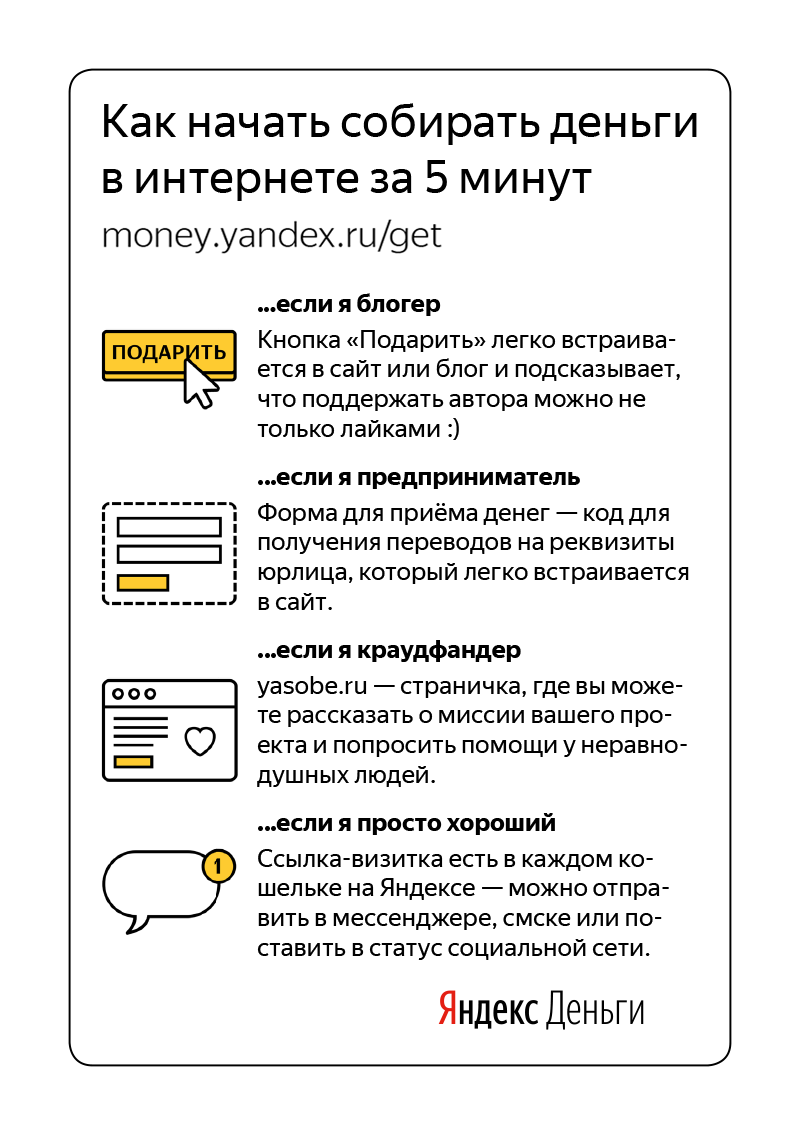 Ниже — памятка, которой удобно делиться на своих сайтах, в чатах, соцсетях и повсюду, где людям могут пригодиться удобные решения для сбора средств в интернете. Пользуйтесь!